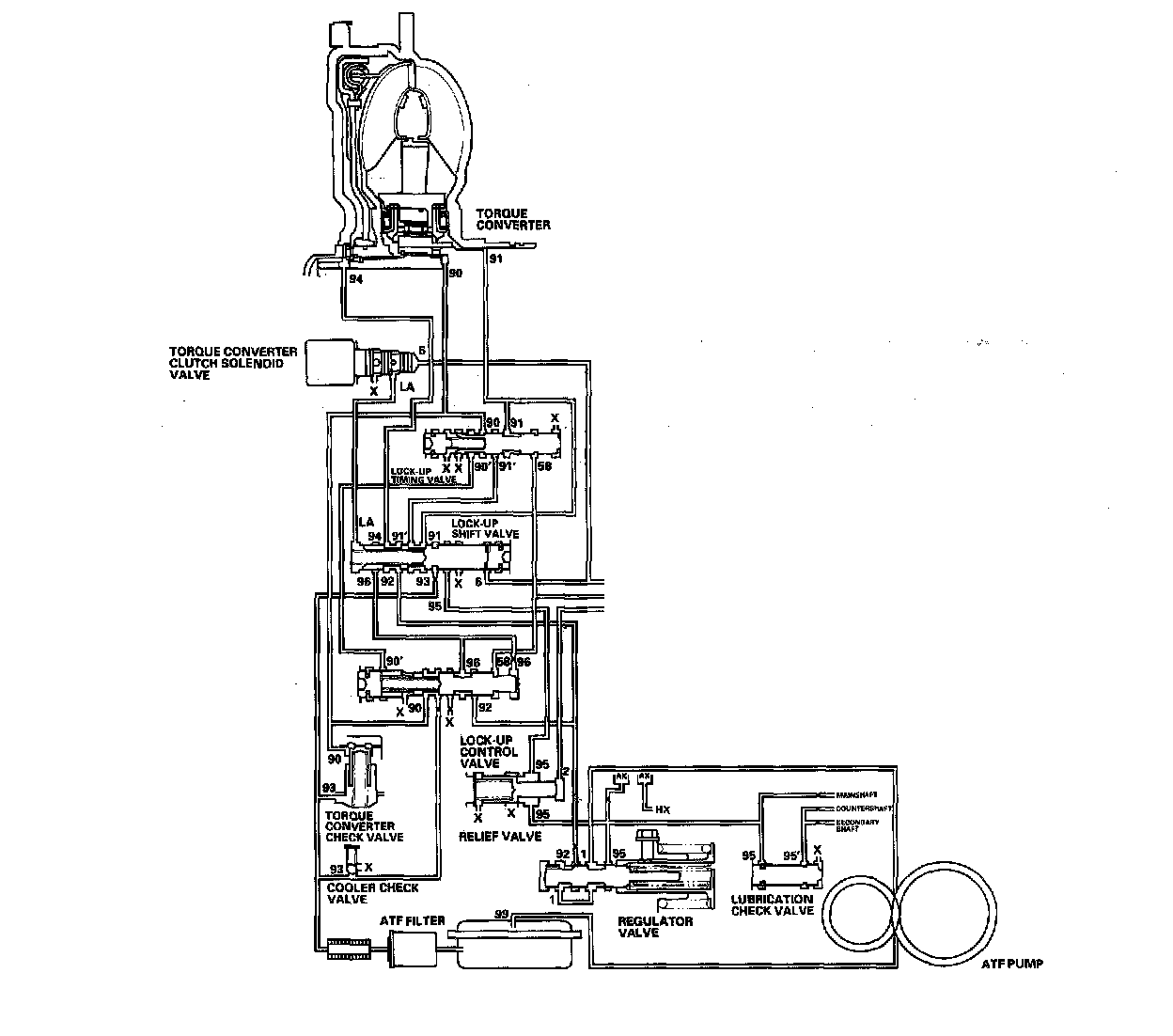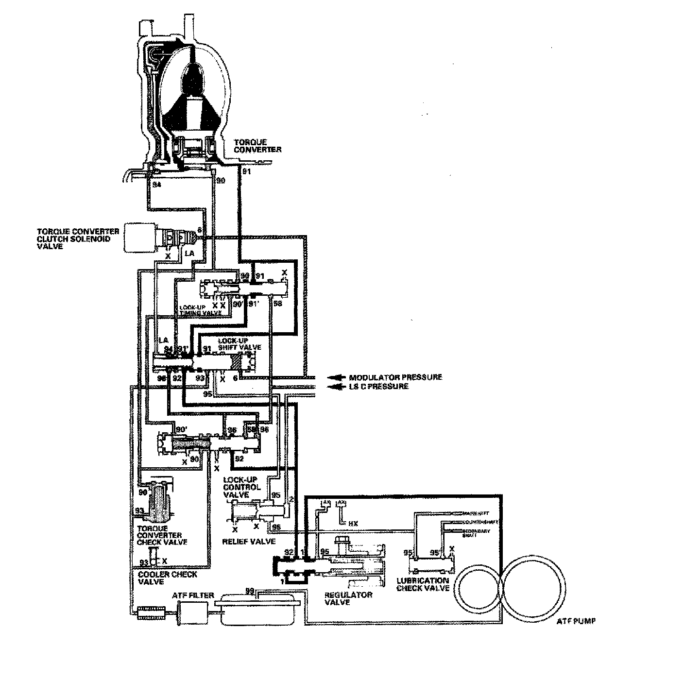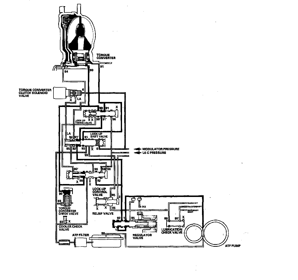 The torque converter clutch solenoid valve is turned OFF by the PCM. The lock-up shift valve receives LC pressure (LA) on the left side, and modulator pressure (6) on the right side. The lock-up shift valve is in the right side to uncover the port leading torque converter pressure (92) to the left side of the torque converter. Torque converter pressure (92) becomes torque converter pressure (94), and enters into the left side of the torque converter to disengage the torque converter clutch. The lock-up is OFF.