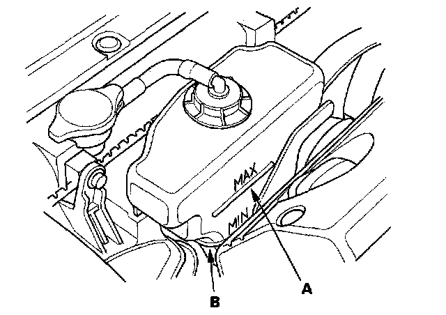 Coolant Check1. Look at the coolant level in the coolant reservoir. Make sure it is between the MAX mark (A) and MIN mark (B).