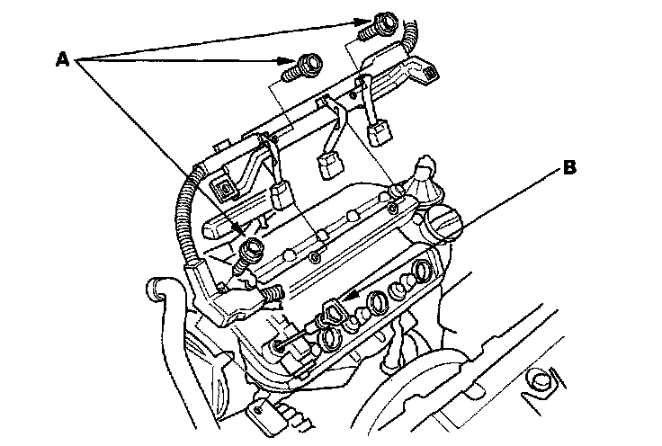 3. Remove the three bolts (A) securing the harness holder, and remove the dipstick (B).