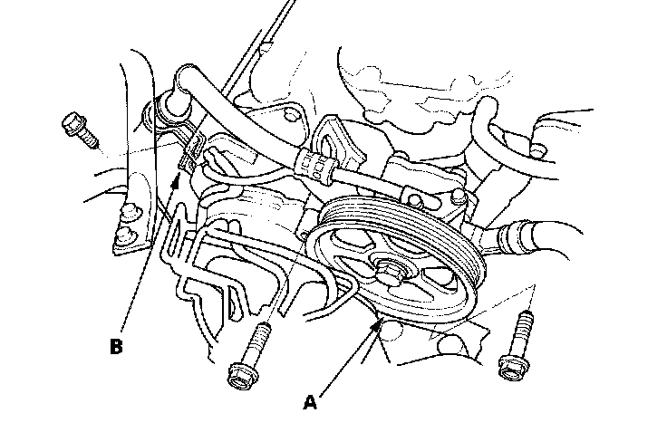 8. Remove the power steering (P/S) pump (A), and P/S hose clamp (B).