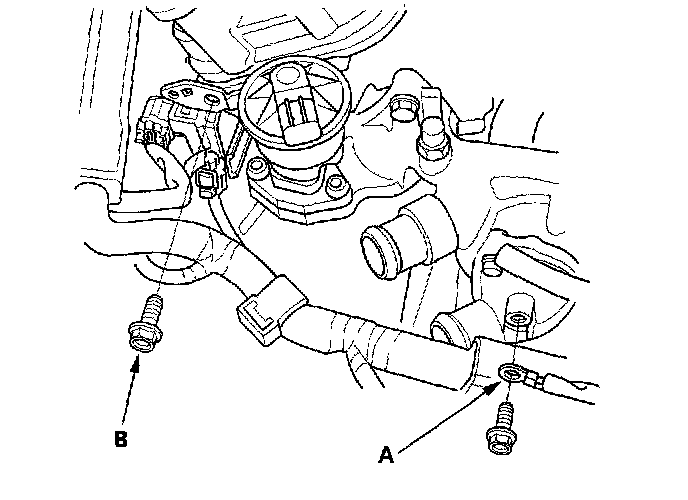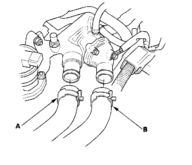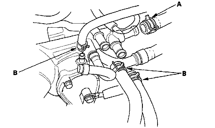 14. Remove the heater hose (A) and water bypass hoses (B).
