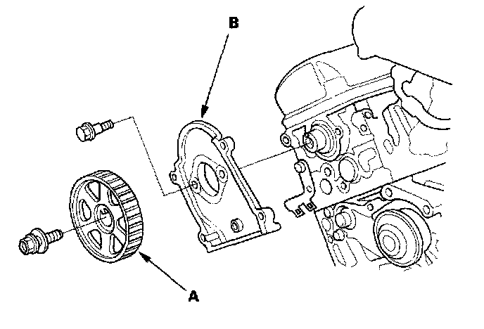 21. Remove the front and rear camshaft pulleys (A) and front and rear back covers (B).