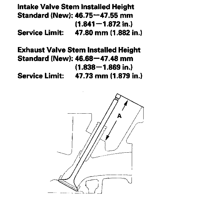 9. If the valve stem installed height is over the service limit, replace the valve and recheck. If it is still over the service limit, replace the cylinder head; the valve seat in the head is too deep.