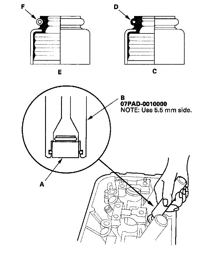NOTE: Exhaust valve seals (C) have a black spring (D) and intake valve seals (E) have a white spring (F). They are not interchangeable.