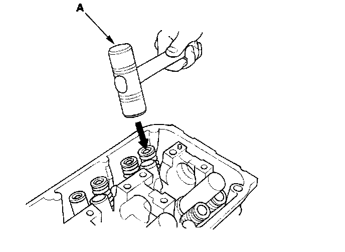 8. Lightly tap the end of each valve stem two or three times with a plastic mallet (A) to ensure proper seating of the valve and valve cotters. Tap the valve stem only along its axis so you do not bend the stem.