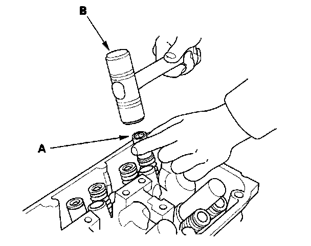 2. Using an appropriate-sized socket (A) and plastic mallet (B), lightly tap the valve retainer to loosen the valve cotters.