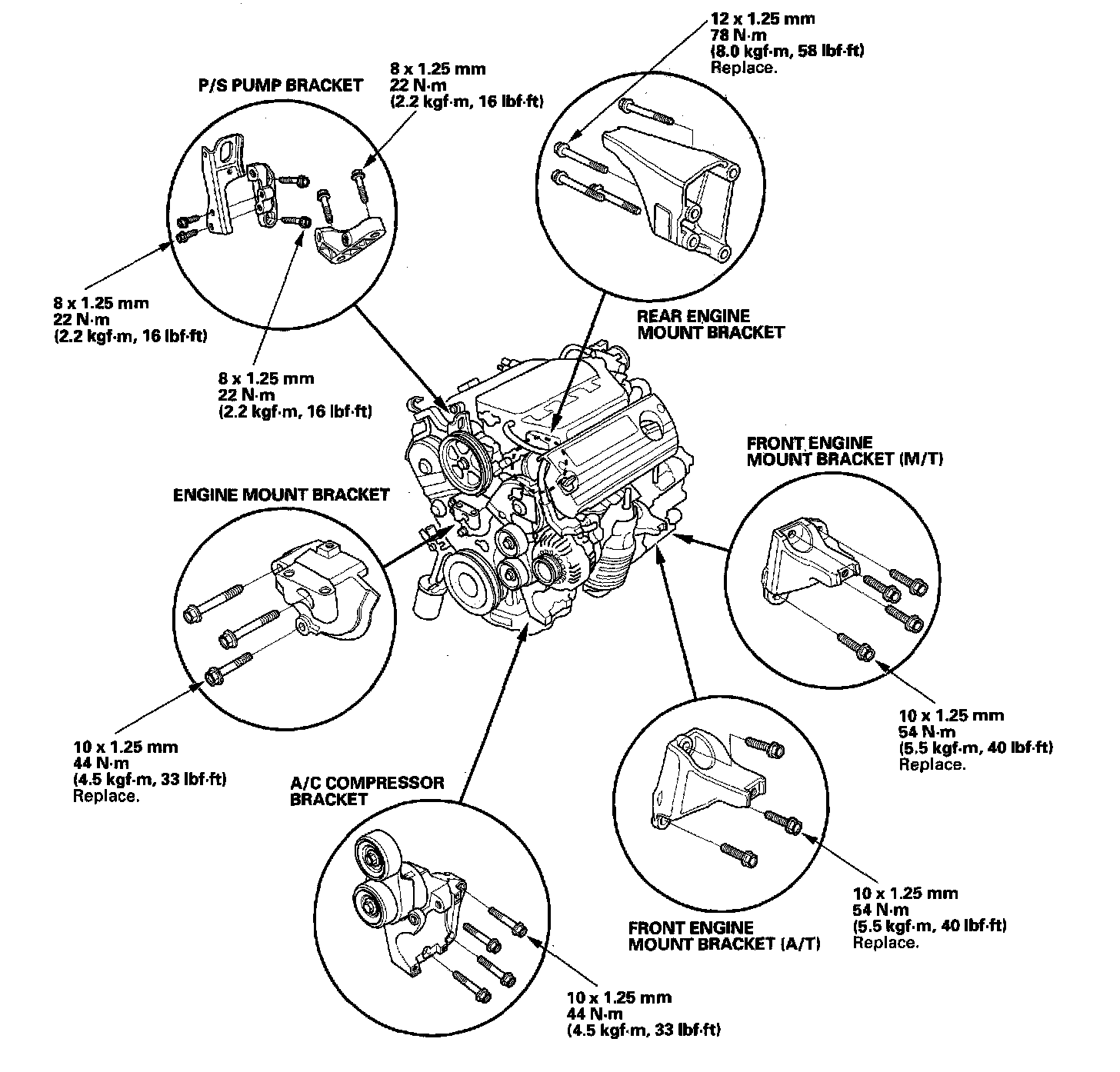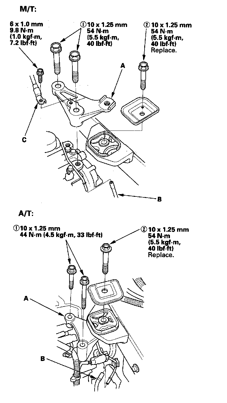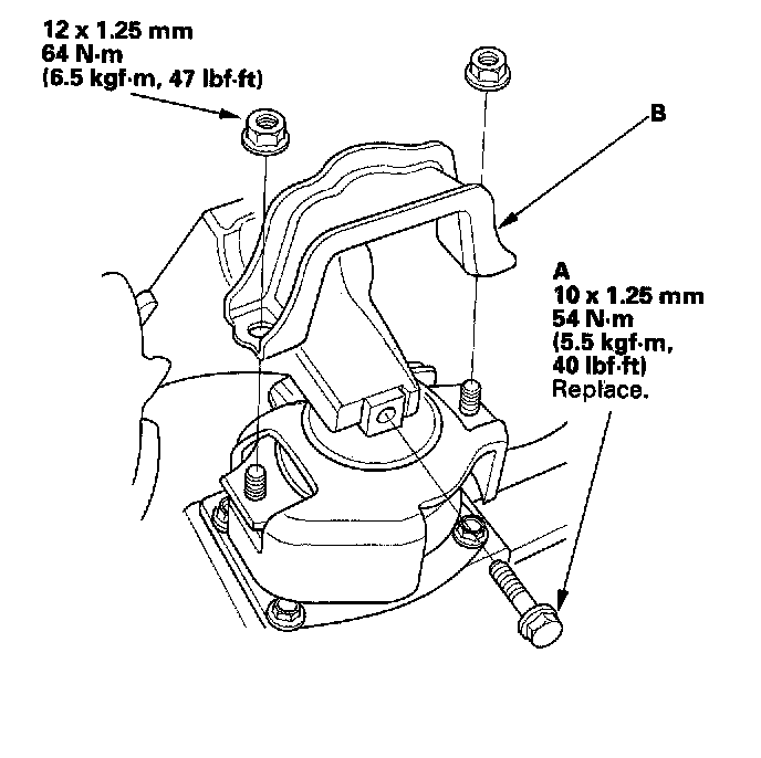 NOTE: Reinstall the mounting bolts/support nuts in the sequence given in following steps. Failure to follow this sequence may cause excessive noise and vibration, and reduce engine mount life.