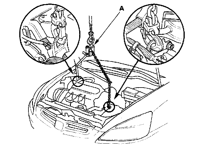 2. Position the engine/transmission assembly under the vehicle. Be sure that they are properly aligned. Carefully lower the vehicle until the engine and transmission are properly positioned in the engine compartment. Make sure the vehicle is not resting on any part of the engine or transmission. Lift and support the engine with a chain hoist (A) and carefully raise the engine/transmission assembly into place.