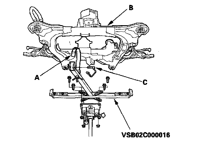 8. Attach the front subframe adapter to the subframe by hanging the belt (A) over the front of the subframe (B), then secure the belt with its stop (C). Raise the subframe up to the body with a jack.