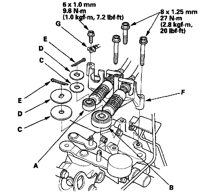 3. Install the engine balancer bar (VSB02C000019); attach the front arm (A) to the front cylinder head with a spacer (B) and 10 x 1.25 mm bolt (C), attach the rear arm (D) to the rear cylinder head with 8 x 1.25 mm bolt (E).