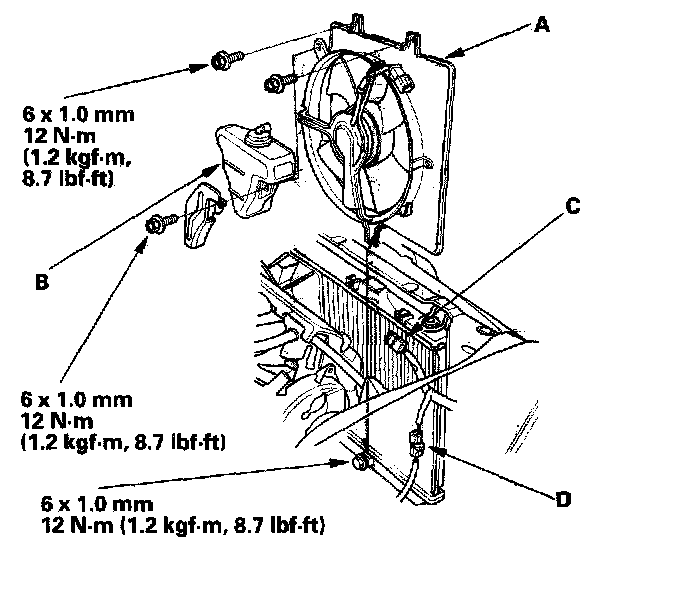 44. Install the condenser fan shroud (A), and reserve tank (B), then connect the fan motor connector (C) and compressor clutch connector (D).
