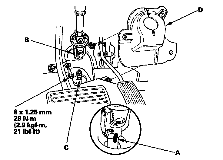 27. A/T model: Install the lock bolt (B) with a new lock washer (C), then bend the lock washer tab against the bolt.