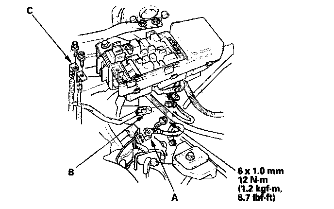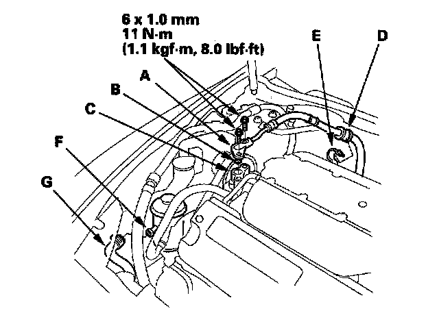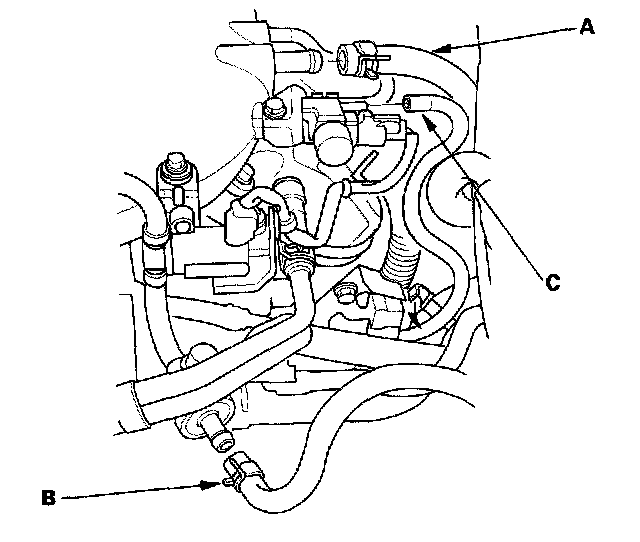 54. Install the brake booster vacuum hose (A), evaporative emission (EVAP) canister hose (B), and vacuum hose (C).