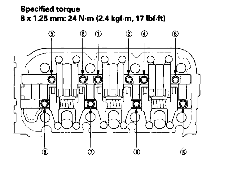 9. Tighten each bolt two turns at a time in the sequence shown to ensure that the rockers do not bind on the valves.