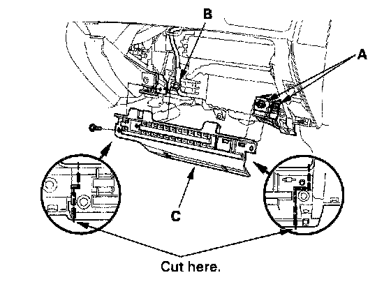 2. Remove the connector clips (A), the wire harness clip (B), and bolt. Cut the plastic cross brace (C) in the glove box opening with diagonal cutters in the area shown. Retain these parts to be reinstalled later.