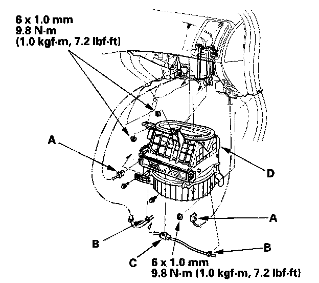 3. Disconnect the connectors (A) from the blower motor and the recirculation control motor, then remove the wire harness clips (B) and the connector clip (C). Remove the mounting nuts, the mounting bolts and the blower unit (D).