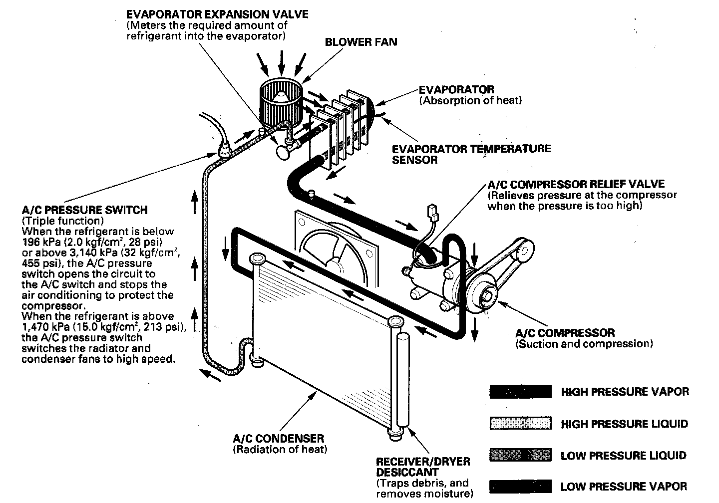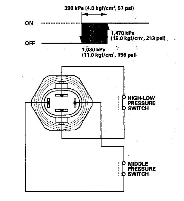 If the refrigerant pressure goes above or below 1,470 kPa (15.0 kgf/sq.cm, 213 psi), the A/C pressure switch opens or closes to signal the PCM to change the speed of the condenser fan and radiator fan (high-low).