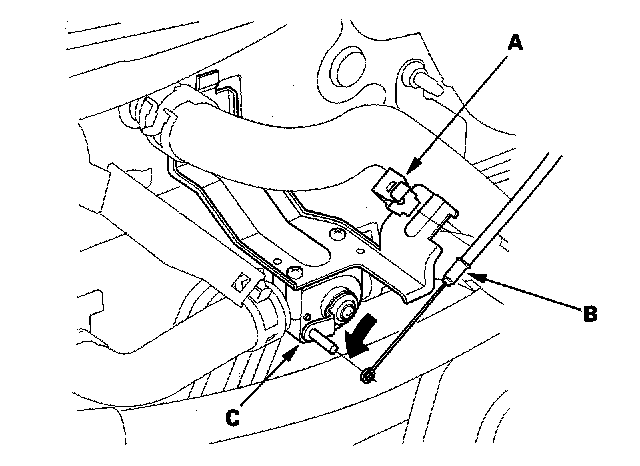 4. From under the hood, open the cable clamp (A), then disconnect the heater valve cable (B) from the heater valve arm (C). Turn the heater valve arm to the fully opened position as shown.