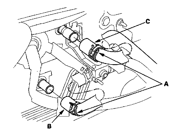 6. Slide the hose clamps (A) back, then disconnect the inlet heater hose (B) and the outlet heater hose (C) from the heater unit. Engine coolant will run out when the hoses are disconnected; drain it into a clean drip pan. Be sure not to let coolant spill on the electrical parts or the painted surfaces. If any coolant spills, rinse it off immediately.