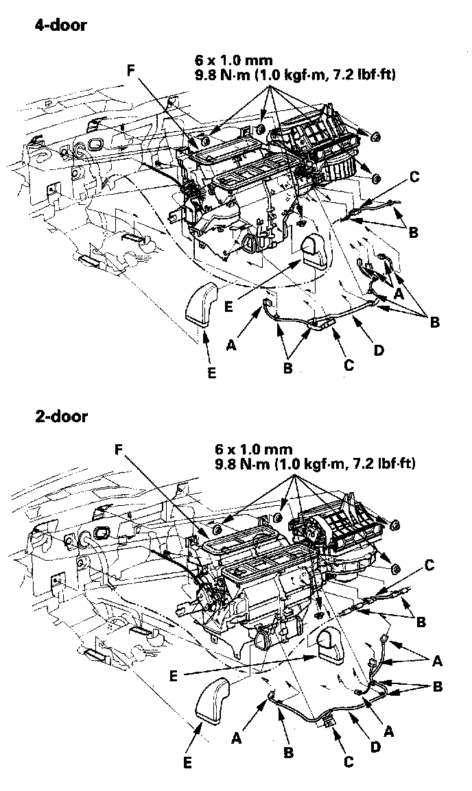 9. Disconnect the connectors (A) from the air mix control motor, the evaporator temperature sensor, the power transistor, and the recirculation control motor, then remove the wire harness clips (B), the connector clips (C) and the wire harness (D). Remove the heater ducts (E), then remove the mounting nuts and the blower-heater unit (F).