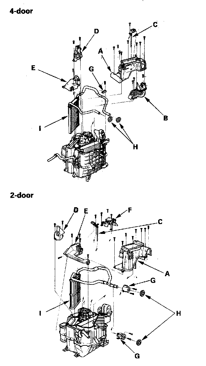 10. Remove the self-tapping screws, the evaporator temperature sensor (C) and the joint duct A, then remove the self-tapping screws and the joint duct B (4-door). Remove the self-tapping screws then remove the passenger's heater outlet (D), and the heater core cover (E). Remove the self-tapping screws and the mode control motor (F) (2-door). Remove the self-tapping screws, the heater pipe brackets (G), the grommets (H) and carefully pull out the heater core (I) so you don't bend the inlet outlet pipes.