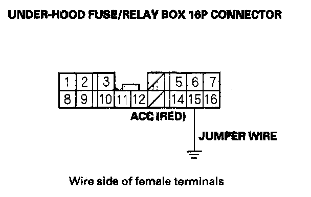 9. Momentarily connect under-hood fuse/relay box 16P connector terminal No. 15 to body ground with a jumper wire several times.
