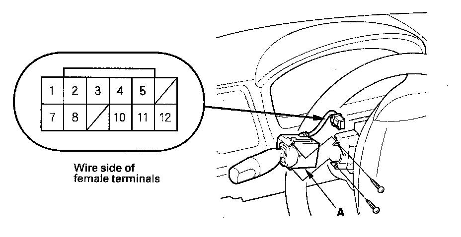 3. Disconnect the 12P connector (A) from the wiper/washer switch (B).