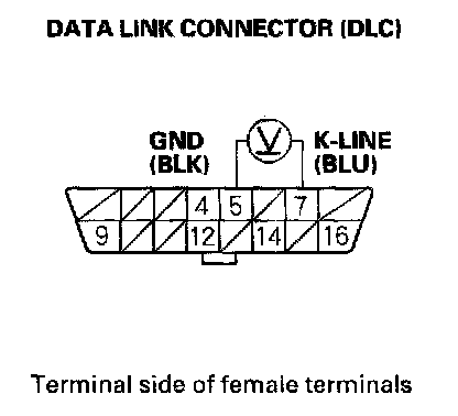 3. Measure voltage between DLC terminals No. 5 and No. 16.