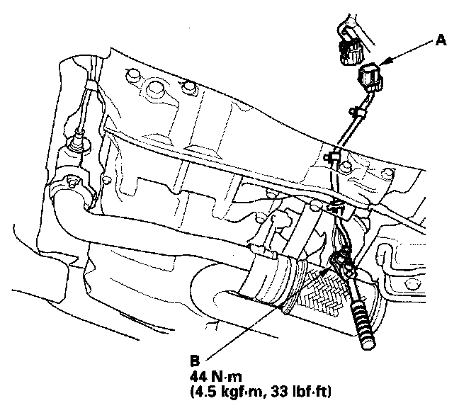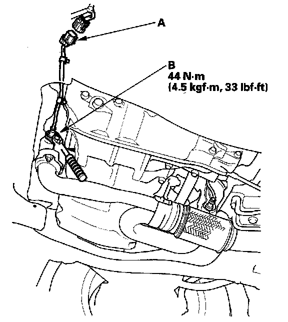 1. Disconnect the rear secondary HO2S (Bank 1) 4P connector (A), then remove the rear secondary HO2S (B).