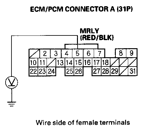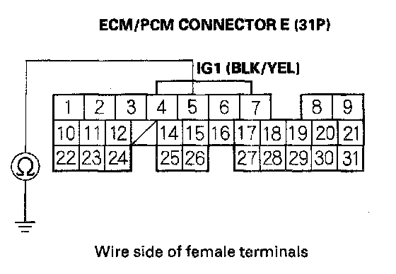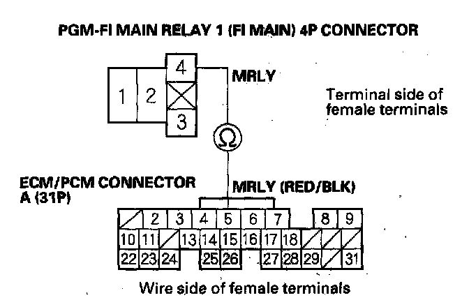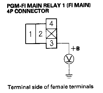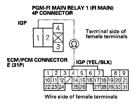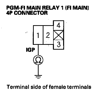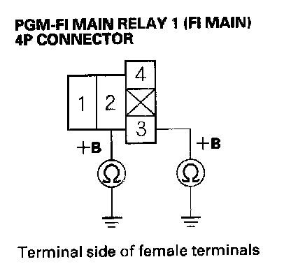 27. Check for continuity between body ground and PGM-FI main relay 1 (FI MAIN) 4P connector terminals No. 2 and No. 3 individually.