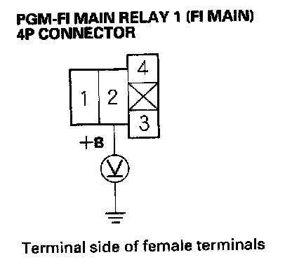 59. Measure voltage between PGM-FI main relay 1 (FI MAIN) 4P connector terminal No. 2 and body ground.