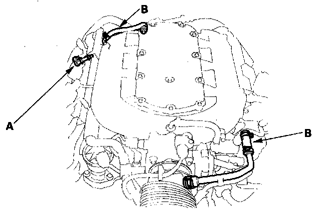 2. Check the PCV valve (A), hoses (B), and connections for leaks or restrictions.