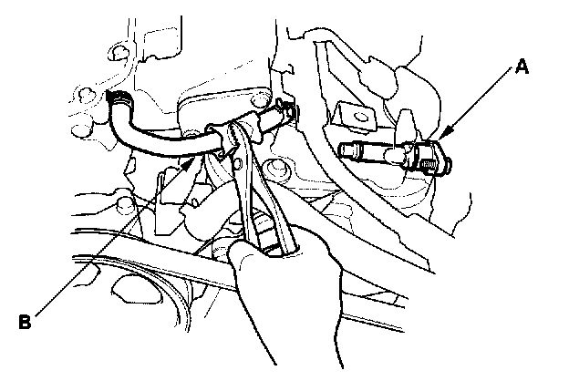 3. At idle, listen to the PCV valve (A) with a stethoscope as you lightly pinch the PCV hose (B) with your fingers or pliers several times. Each time the hose is pinched, the valve should click