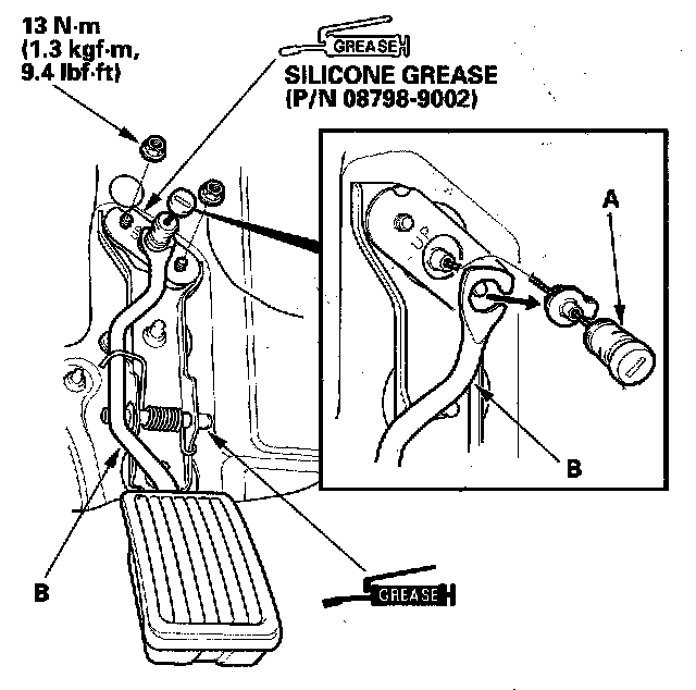 4. Remove the throttle cable (A) from the accelerator pedal (B).