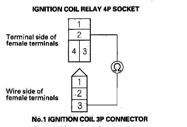 4. Check for continuity between ignition coil relay 4P socket terminal No. 2 and the No. 1 ignition coil 3P connector terminal No. 3.
