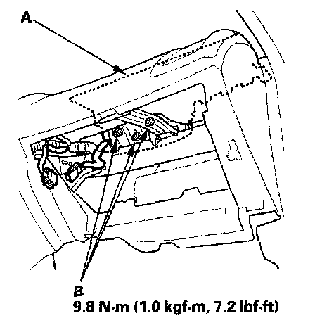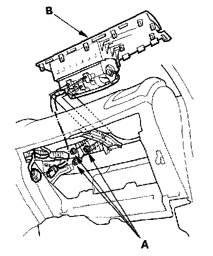 5. Remove the three mounting nuts (A) from the bracket. Cover the lid and dashboard with a cloth, and pry carefully with a flat-tip screwdriver to lift the front passenger's airbag (B) out of the dashboard.