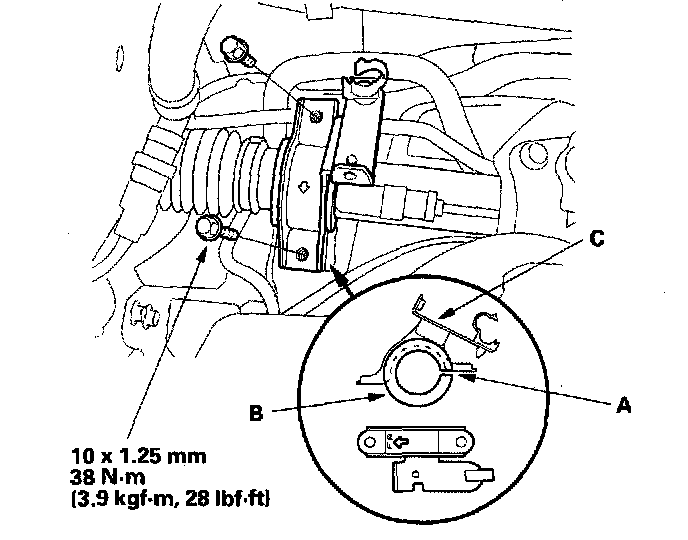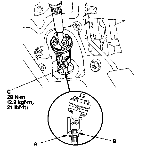 27. Align the bolt hole (A) on the steering joint with the groove (B) around the pinion shaft, and loosely install the joint bolt (C). Make sure that the joint bolt is securely in the groove of the pinion shaft. Pull on the steering joint to make sure that the steering joint is fully seated.