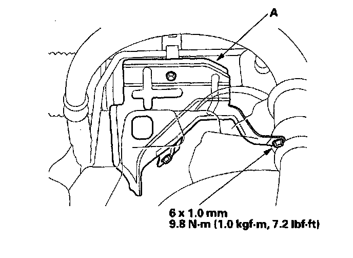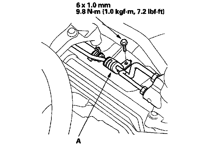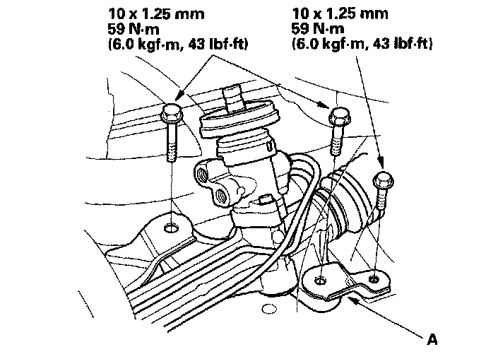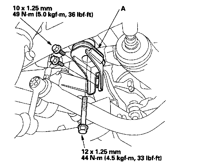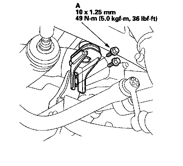 10. Install the steering stiffener plate (A) and gearbox mounting bolts on the left side of the gearbox, then tighten them to the specified torque.