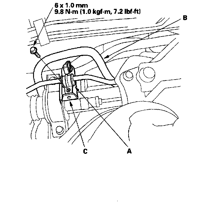 18. Install the rear suspension subframe bracket (B) mounting bolt (C), then tighten new subframe mounting bolt (D) to the specified torque.