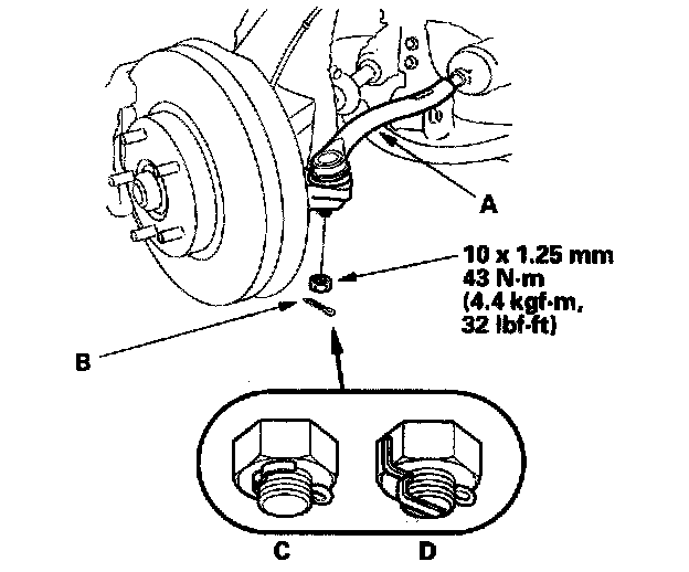 22. Install the tie-rod end ball joint nut, and tighten it to the specified torque. Then install the new cotter pin (B), and bend it as shown (C) or (D).