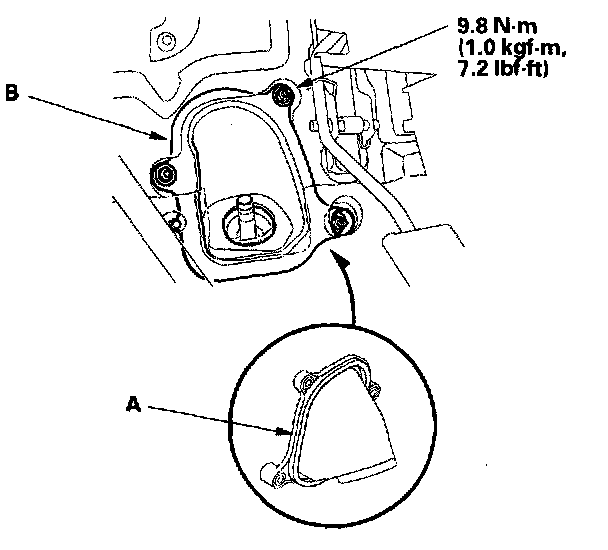 8. Position the cutout (A) on the mounting cushion (B) as shown, and install it on the cylinder of the gearbox securely.