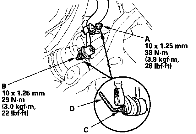 2. Remove the self-locking nut (A) and flange nut (B) while holding the respective joint pin (C) with a hex wrench (D), and remove the stabilizer link (E).