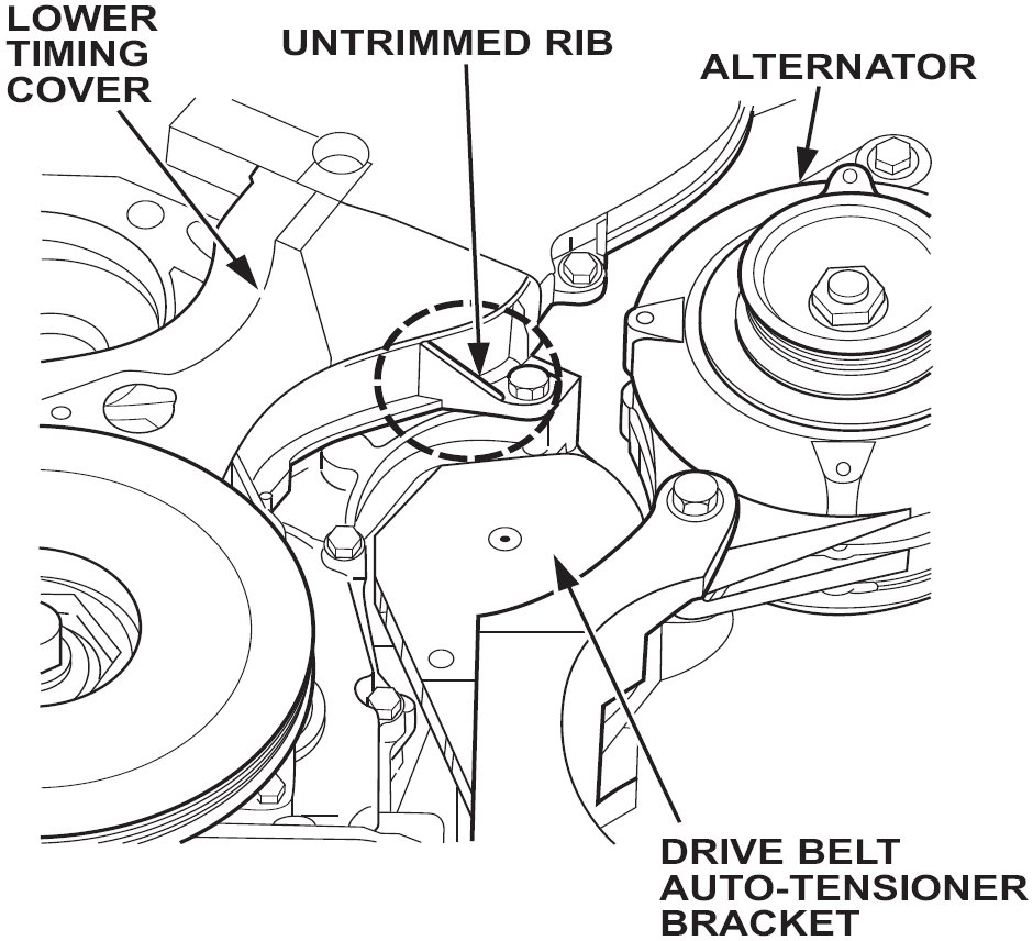 Replacement drive belt auto-tensioners have been updated. Installing this updated auto-tensioner requires the lower timing cover to be trimmed slightly for clearance.
