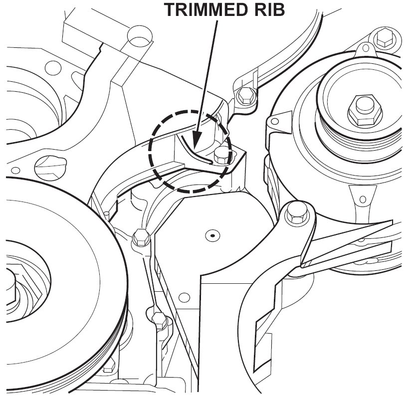 Trim the rib of the lower timing belt cover before installing the updated drive belt auto-tensioner.