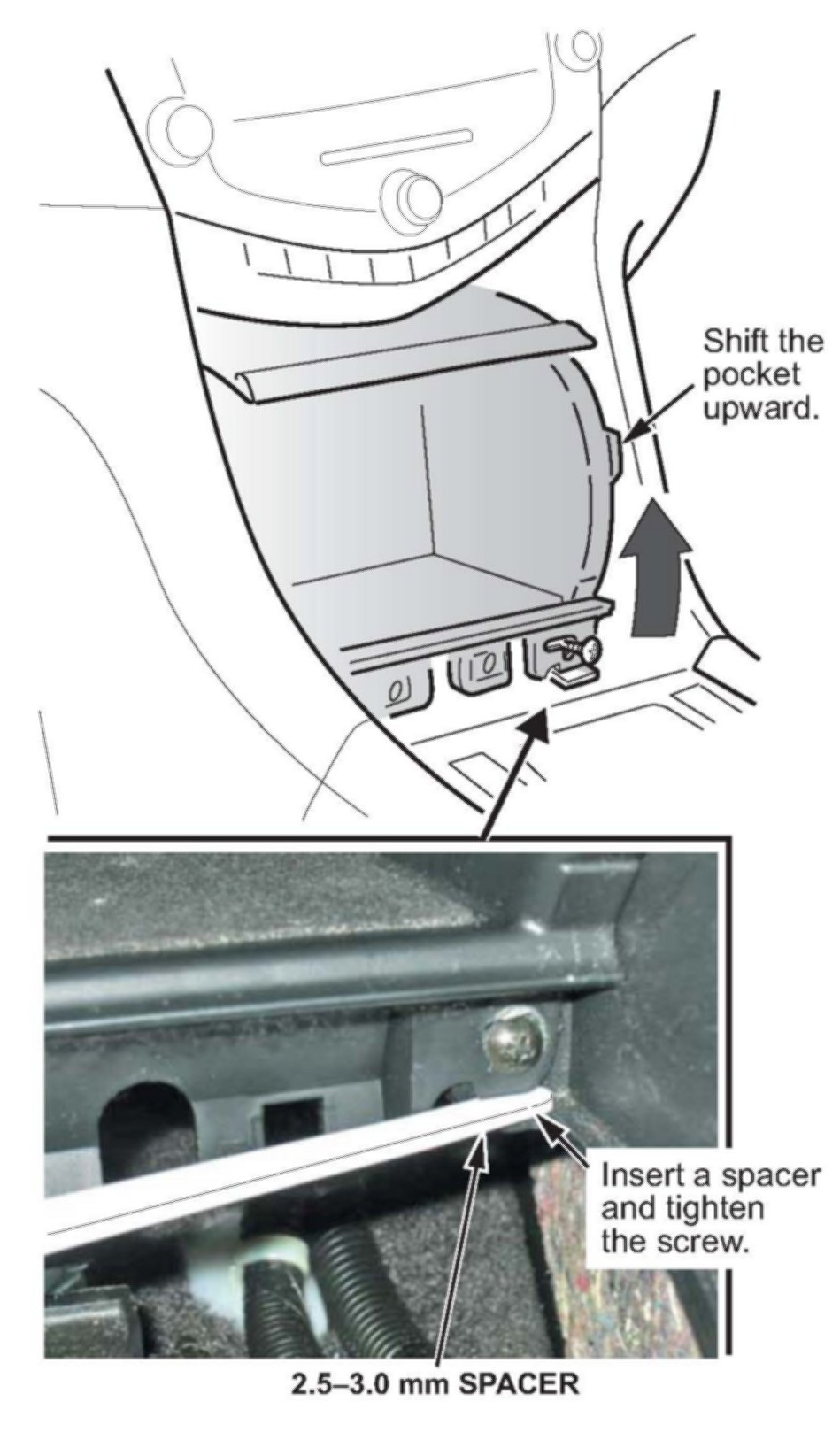 ^ Insert a 2.5-3.0 mm spacer between the pocket and the passenger's center lower cover.