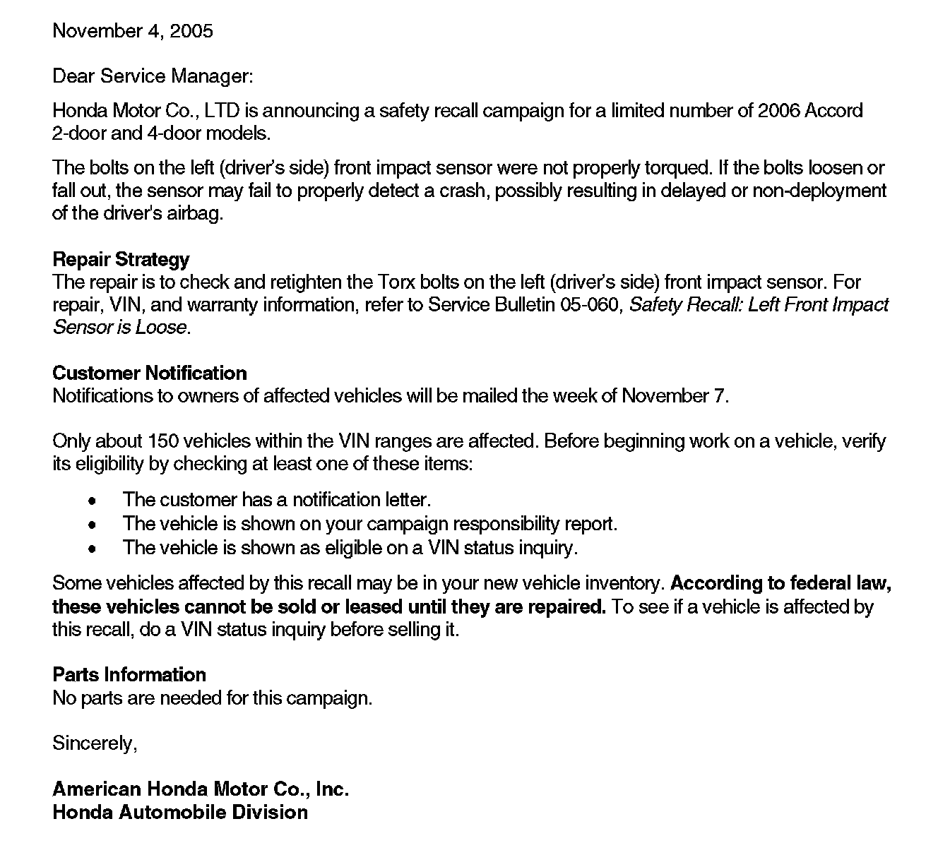 Recall - Left Front Impact Sensor Loose