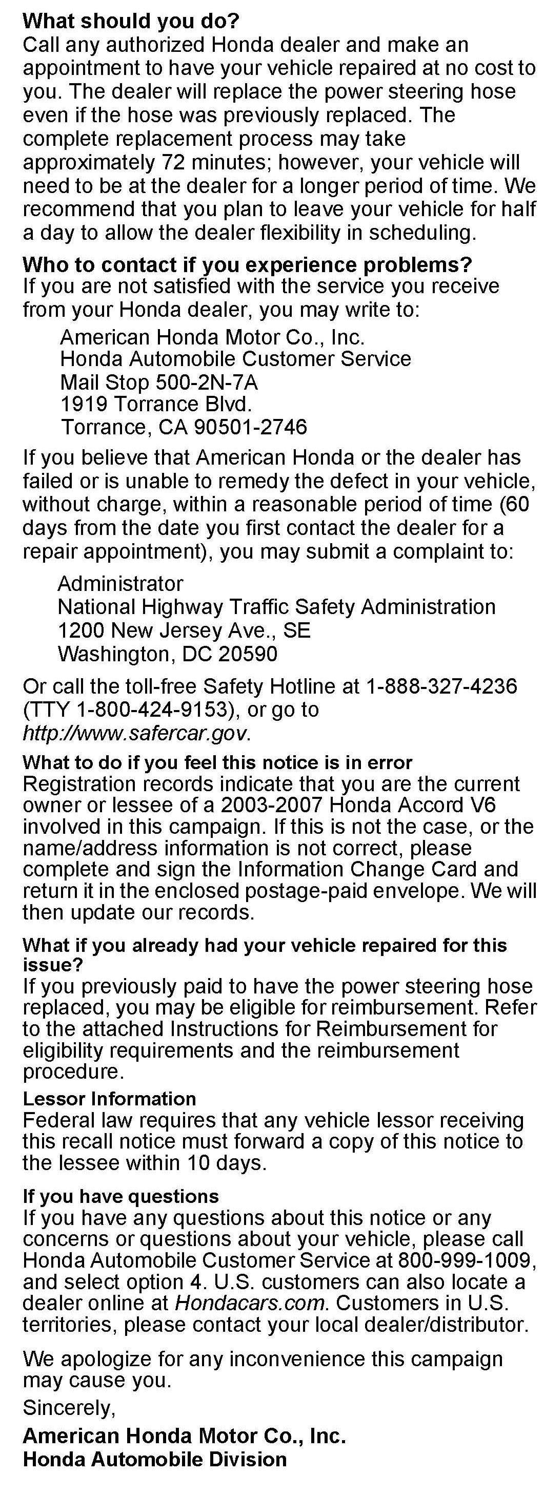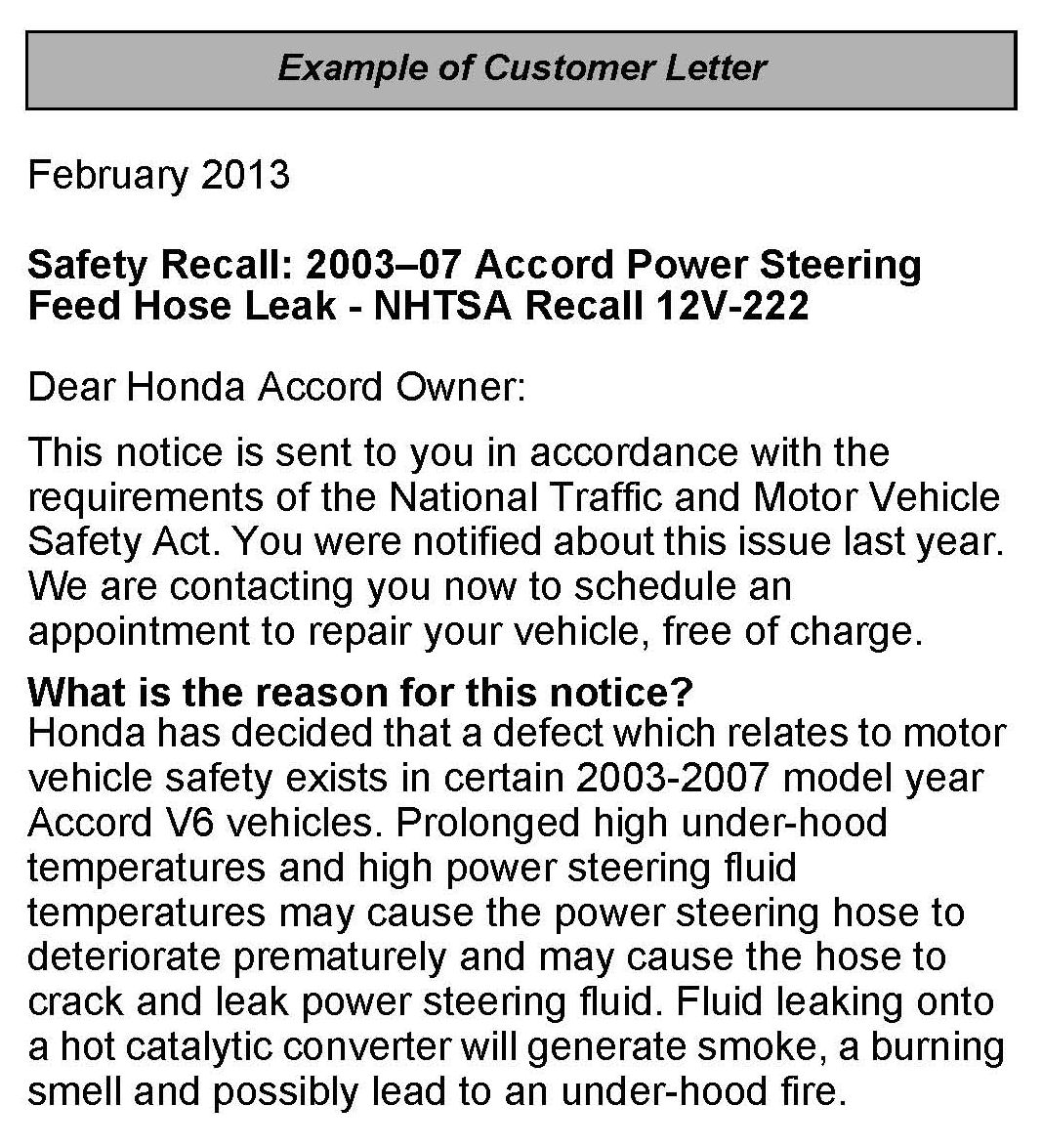 Safety Recall: 2003-07 Accord Power Steering Feed Hose Leak (Supersedes 13-012, dated January 26, 2013, to revise the information marked by the black bars)