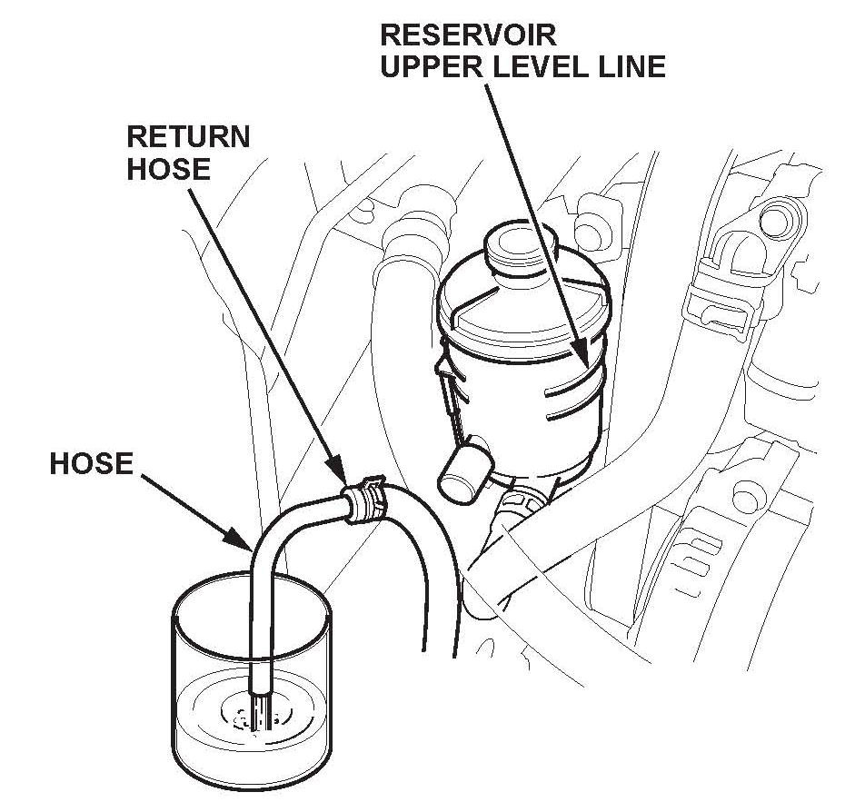 ^ Connect a properly sized hose to the disconnected return hose, and put the hose in a container large enough to hold the fluid.
