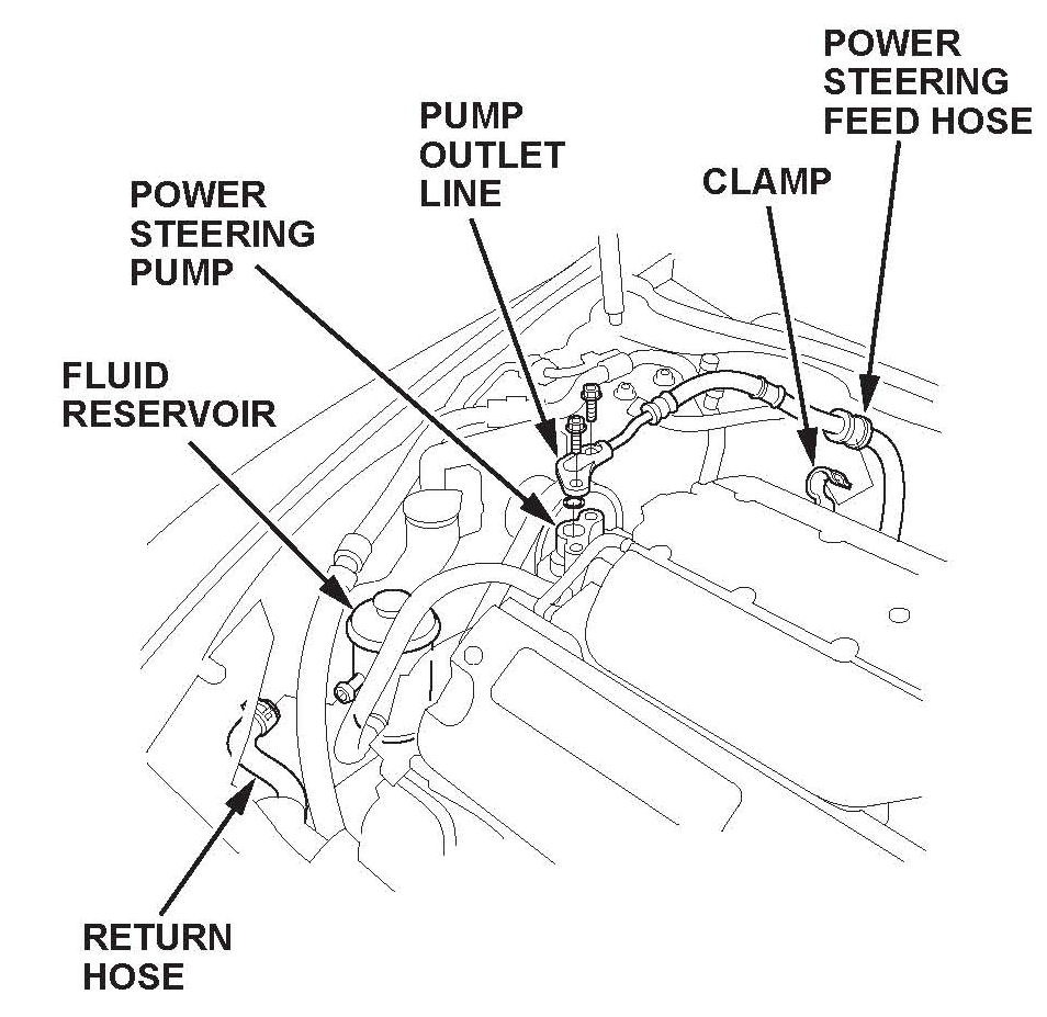 2. Remove the P/S pump outlet hose from the P/S pump, then plug the outlet hose and the P/S pump. Remove the P/S feed hose from the clamp.