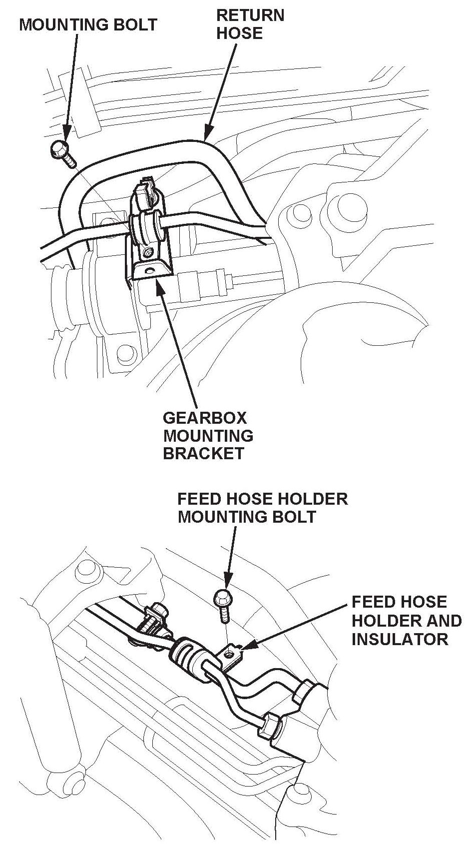 15. Install the replacement P/S hose and install the new feed line holder and insulator.